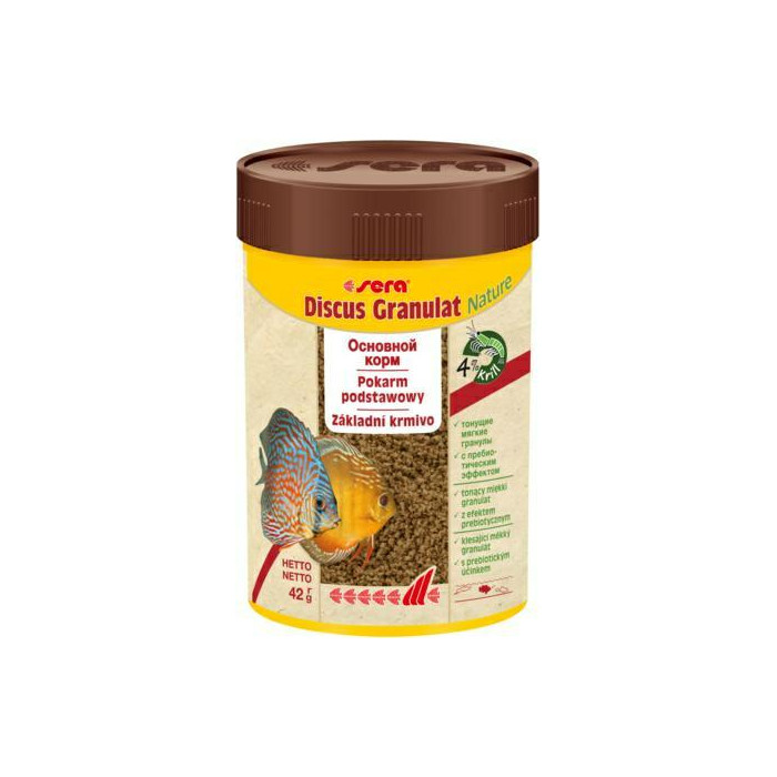 sera Discus Granules Nature to pokarm podstawowy bez barwników i konserwantów w postaci starannie wyprodukowanego miękkiego granulatu dla wszystkich paletek (także młodych) oraz innych wymagających ryb ozdobnych.